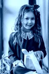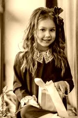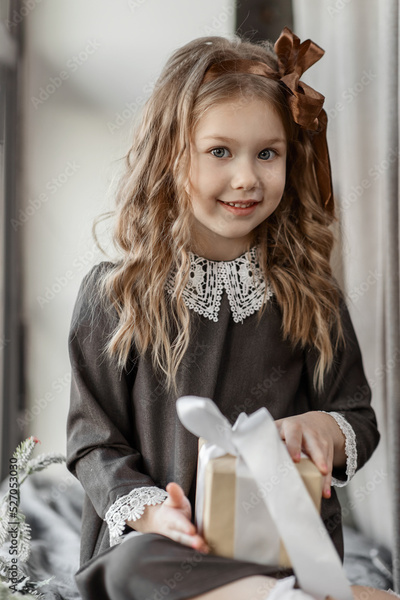 Portrait of a cheerful 5-year-old girl opening a Christmas gift sitting on the windowsill