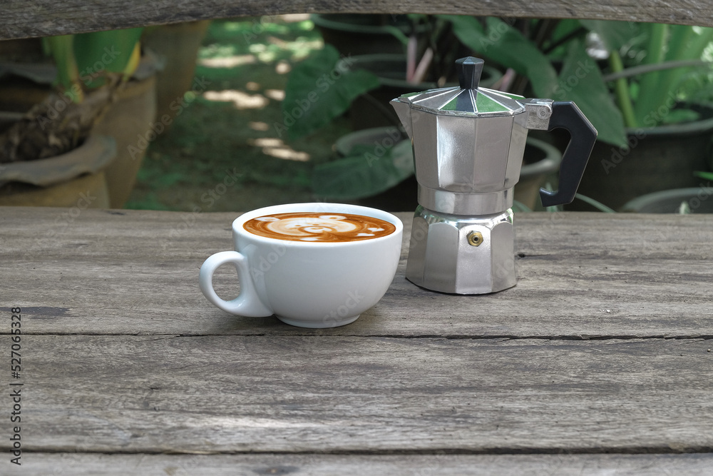 Latte art with moka pot on wood background.