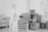 Photo of pedigree cute dog poses on pile of cardboard boxes with owner belongings, relocate in new flat, empty room with white walls, lamp and sofa, big window. Animals and Moving Day concept