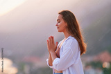 Inspired hopeful serene female meditate with closed eyes and standing alone with praying hands at sunset. Relief stress and clean healthy minds