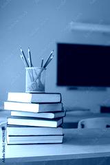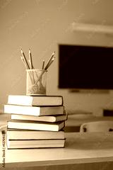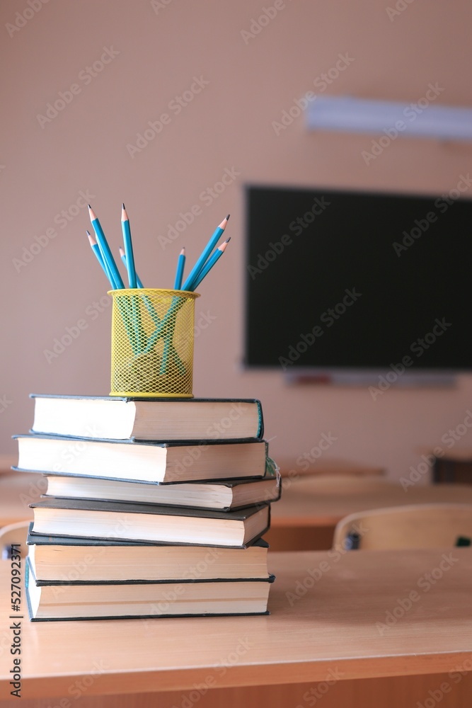 a yellow stand with pencils stands on the books in the classroom against the background of the blackboard. concept of school