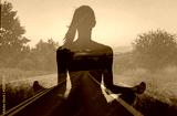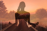Finding your inner peace, getting away form it all, and free your mind concept. Woman meditating facing a empty country road.