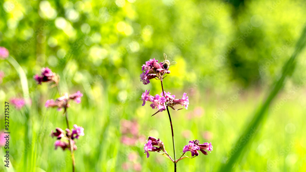 Bee and flower. Close up of a large striped bee collects honey on a yellow flower on a Sunny bright day. Macro horizontal photography. Summer and spring backgrounds