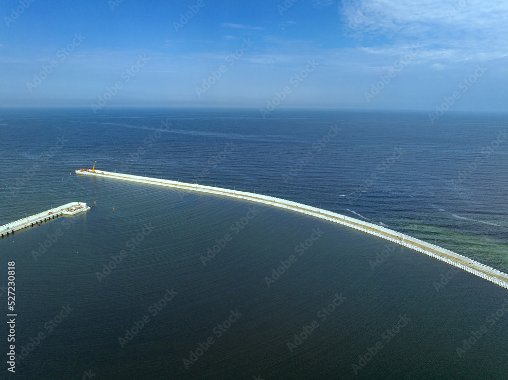 Construction of a canal to the Baltic Sea on the Vistula Spit. The Bay of Gdańsk to the Vistula Lagoon. Construction site from above. Poland. Europe.