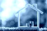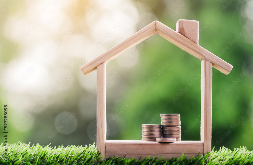 Coins placed is in a model house on the grass. planning savings money of coins to buy a home concept for property, mortgage and real estate investment, savings for a house.
