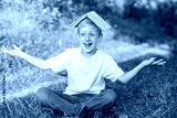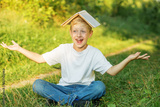 Child boy with book. Having fun. Little schoolboy fooling around in park, holding book on head