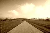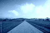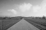 Straight country road through flat farm fields in Amish country, Ohio with rolling hills in the distance in summer
