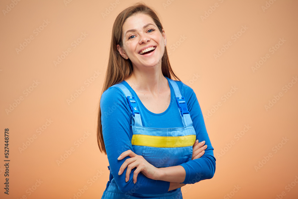 Builder woman or student in work overalls with arms crossed. Isolated female portrait.