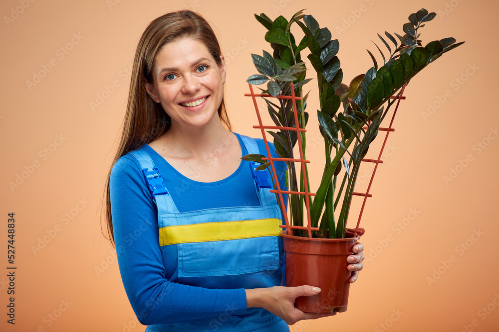Smiling woman in overalls holding houseplant. Isolated female portrait.