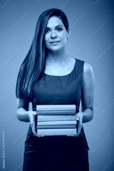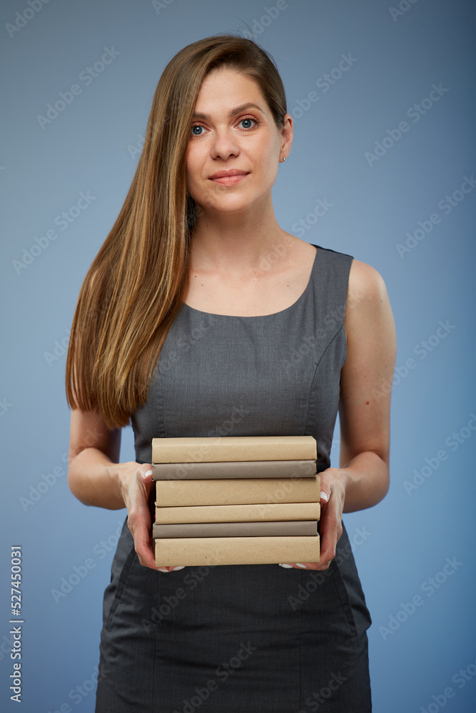 Smiling female teacher or student girl holding books stack isolated portrait.