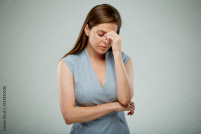 Business woman with headache, migraine or depression diseased isolated portrait.