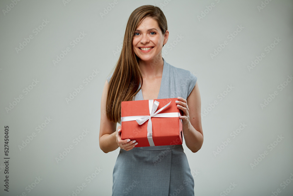 Smiling girl holding gift box. isolated female portrait.