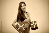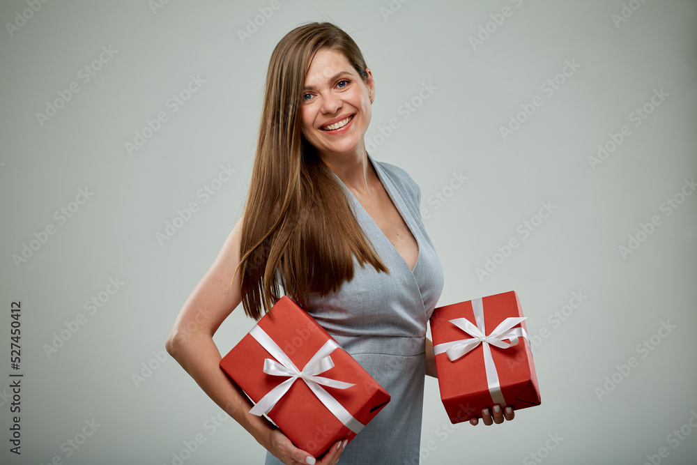 Happy woman with gifts. Isolated portrait of business woman with present.