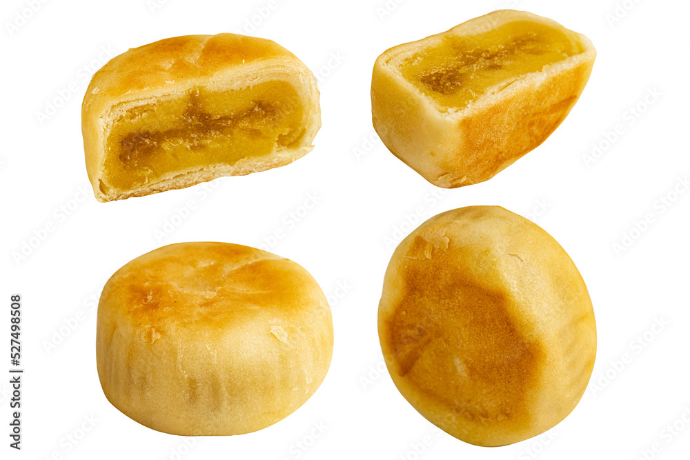 Vietnamese Vegan pia cake (or Banh Pia moon cake, durian cake) isolated on white background