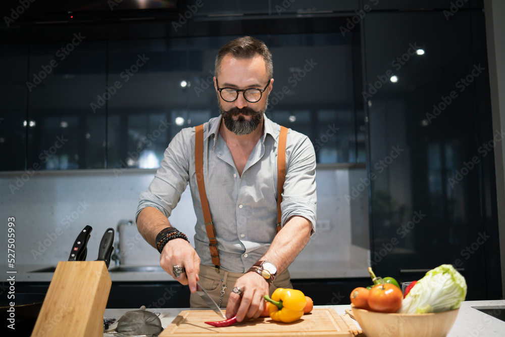 white adult male family indoor happy modern cooking lifestyle.The men prepare the breakfast ingredients.Lifestyle cooking