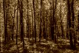 Sun beams through thick trees branches in dense green forest