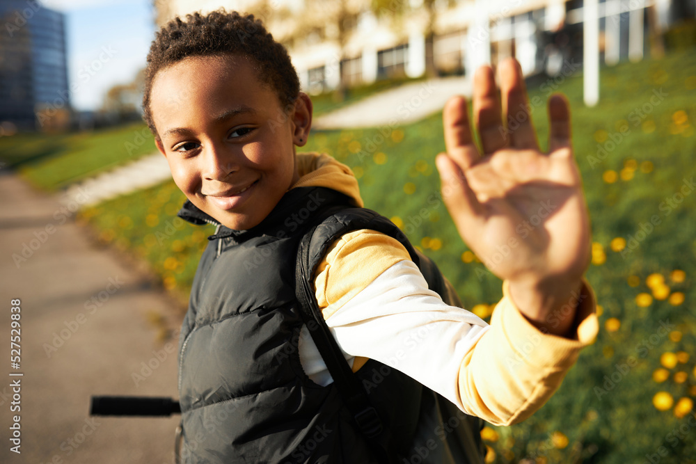 Portrait of happy schoolboy smiling saying bye to his classmates after school classes, riding scooter on his way home, carrying backpack on shoulders, looking happy. Carefree childhood, education