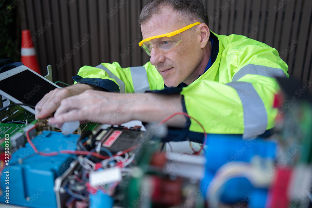 solar power plant engineers and examining photovoltaic panels. Concept of alternative energy and its service. Electrical and instrument technician..