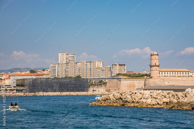 View of the entrance of the Old Port of Marseille and the Fort Saint-Jean fortification