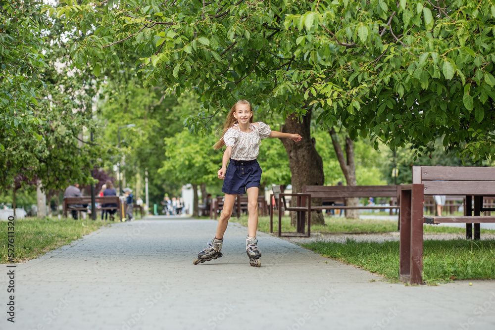 Teen girl rollerblading fast at skate park. Having fun. Concept of an active lifestyle and childhood