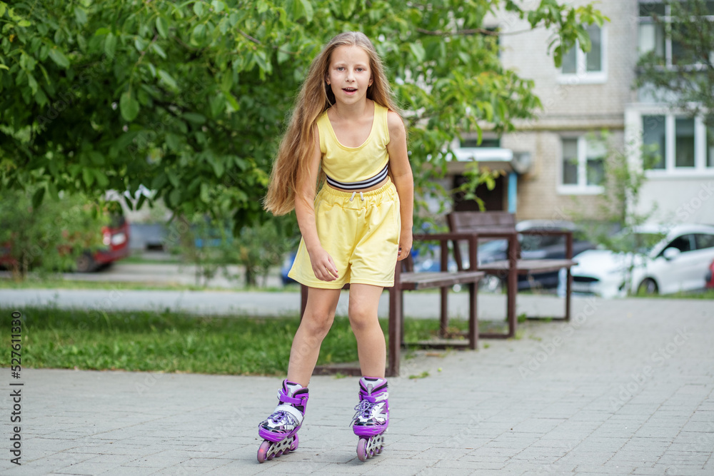 Child rollerblading fast at skate park. Having fun. Concept of an active lifestyle, hobbies