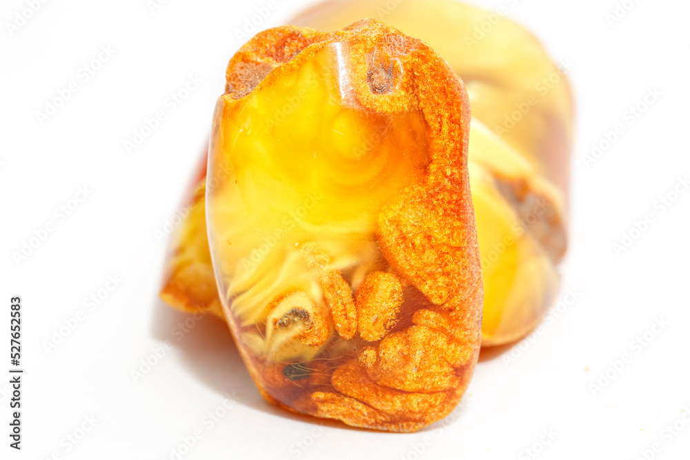 Amber with patterns on a white background. landscape mineral. Sun stone. Jewelry material. Natural beauty. Fossil fossilized resin. Copal. Landscape. patterns. Play of light. Crystal