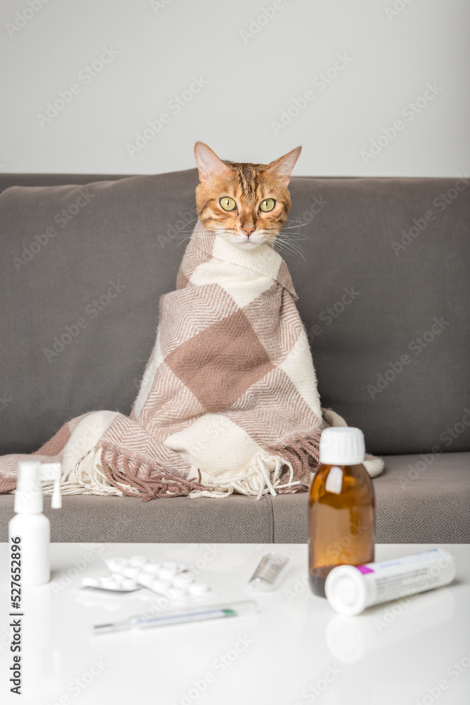 Sick cat on the couch, wrapped in a blanket. A young cat with flu or coronovirus symptoms being treated at home.