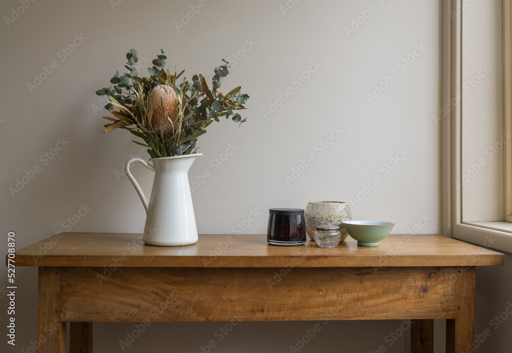 Australian native flowers in white jug wtih little bowls on oak side table against beige wall