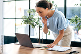Focused busy brazilian or hispanic female employee, talking on smartphone during work paperwork project, stand in modern office. Successful mixed race business woman having cell phone conversation