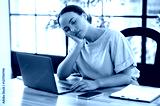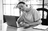 Sleepy tired overworked brazilian or hispanic business woman, office worker, sitting at table with laptop in office, fell asleep leaning on her arm, experiencing chronic sleep deprivation, need rest