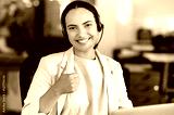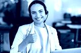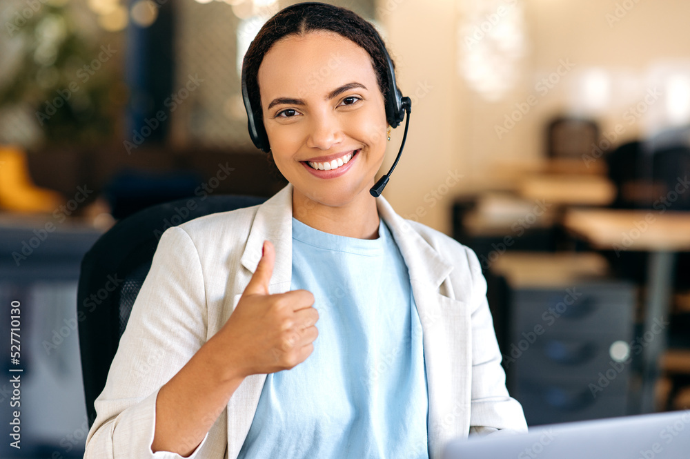 Positive confident mixed race woman, with earphones, call center agent, support service operator, sits in the office, work distantly, consult clients online, looking at camera, smiling, shows thumb up