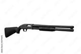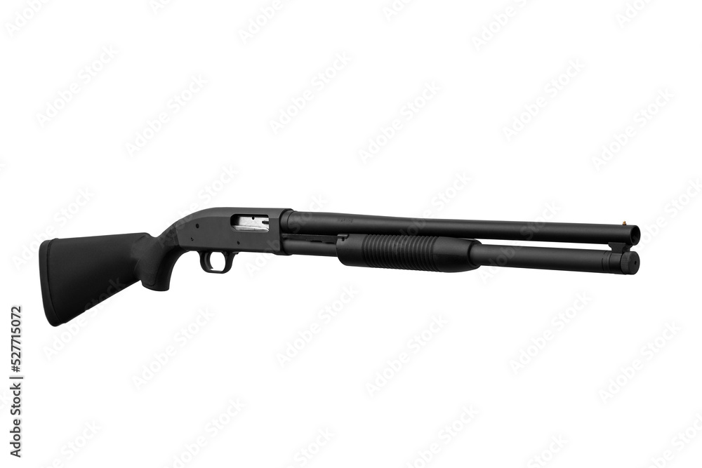Pump-action 12 gauge shotgun isolated on a white back. A smooth-bore weapon with a plastic stock.