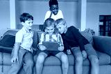 Multiracial elementary schoolboys looking at digital tablet while sitting on couch in school
