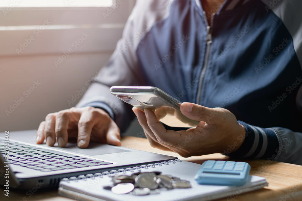 Business investment-finance accounting concept. Planning, saving money. man's hand holding smartphone and using keyboard of laptop computer with money stack step up growing growth on office desk.
