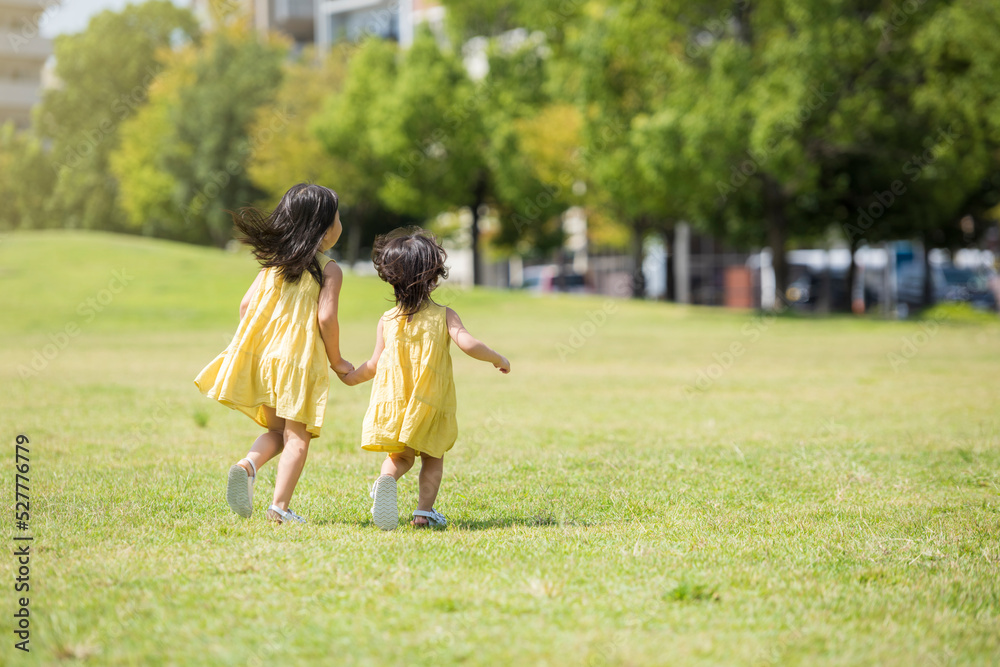 夏の芝生の公園で元気に遊ぶ姉妹