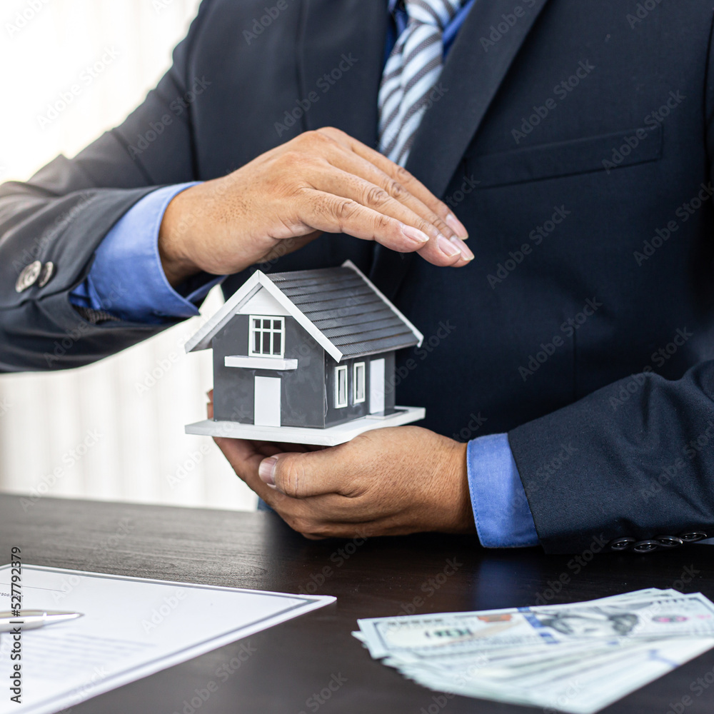 Sales manager or real estate agent prepares to hand over the keys and the house together with the insurance to the customer, Attention to property services and insurance concept.