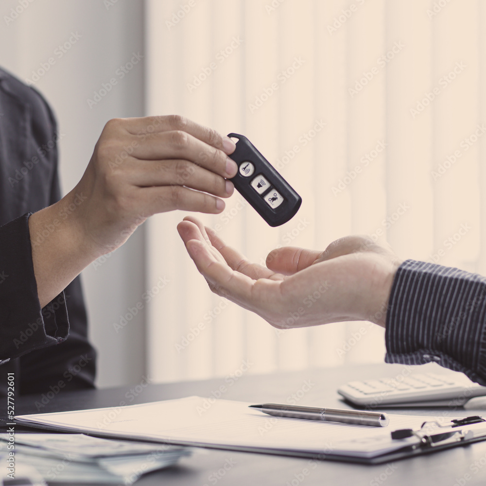 Car sales representative or sales manager submits a car key to a client who has approved financial loans with the company, Approval of financial and banking loans concept.