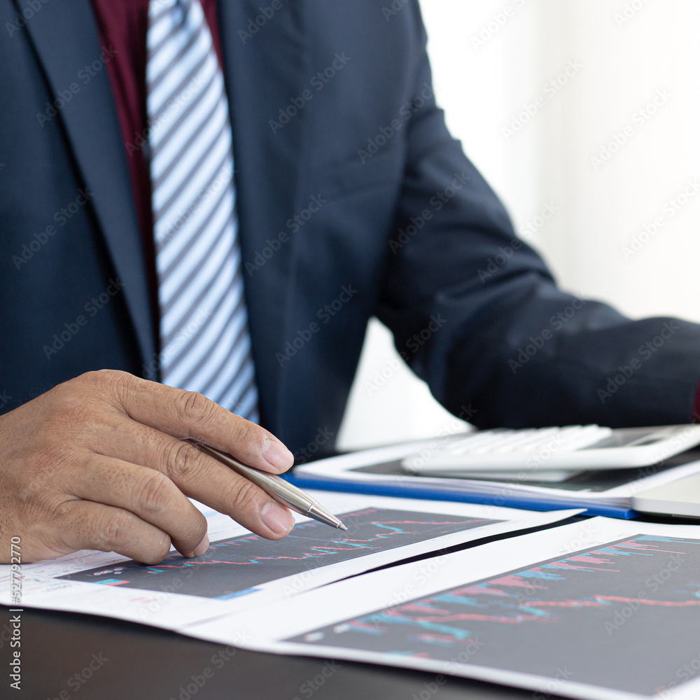 Male investment businessman has analyzed the market of the stock graph and evaluated the financial risks with the Business Intelligence Finance dashboard in a laptop, Stock market concept.
