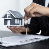 Real estate agent holds the keys to send to the client and offers the conditions for signing the house sale agreement and home insurance to the client, Home sales and home insurance concept.