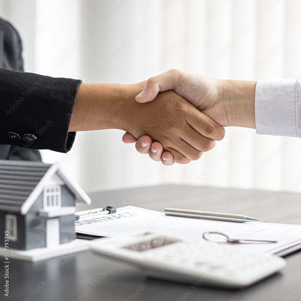 Property manager Shake hands with congratulations on the customers who bought the house with insurance, Hand shake, Success and congratulations concept.