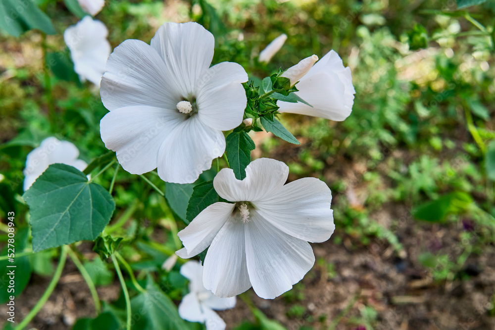 Flowers and buds of plant lavatera white beauty on blurred background. Close-up.