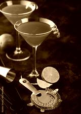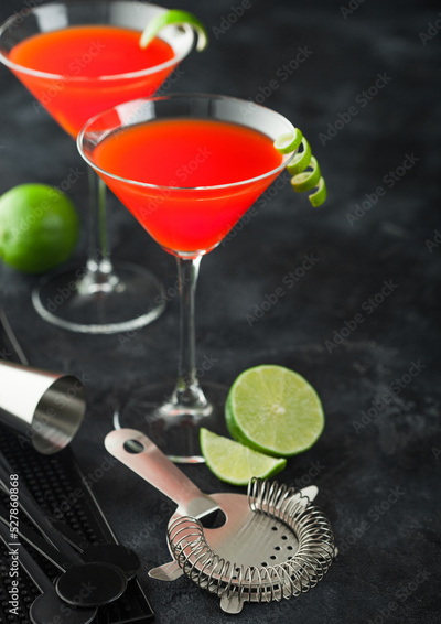 Cosmopolitan cocktail in classic crystal glasses with lime peel and fresh limes with strainer on black background.
