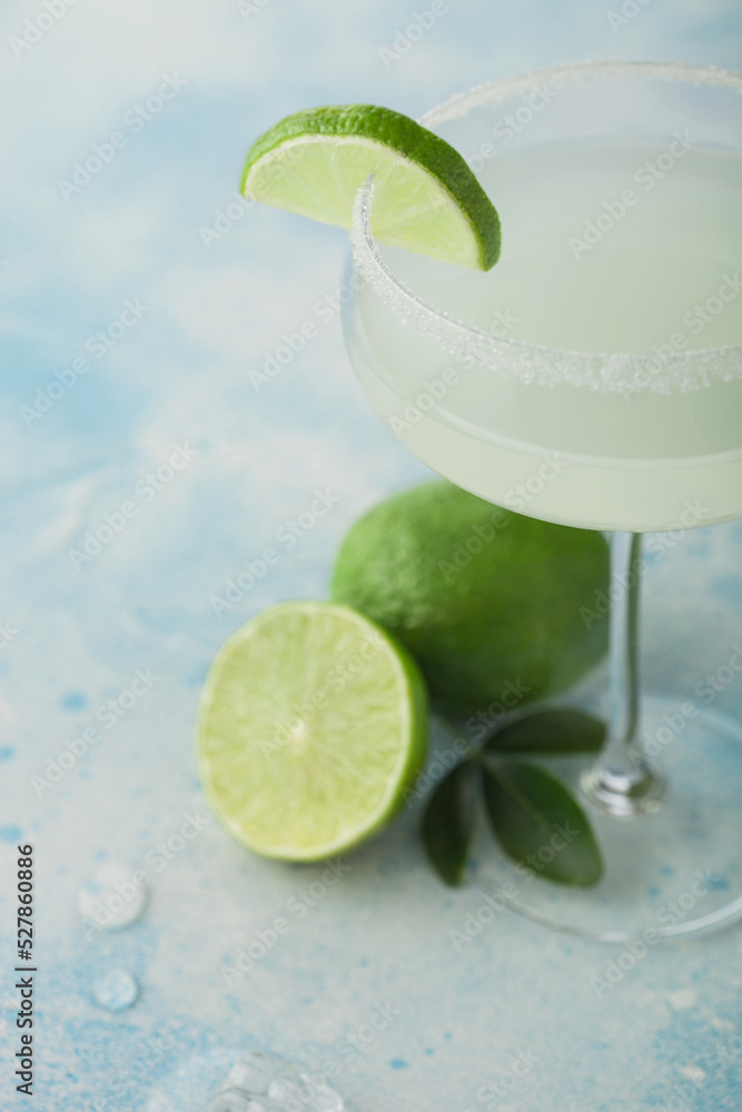 Crystal glass of Margarita cocktail with fresh limes on light blue background.