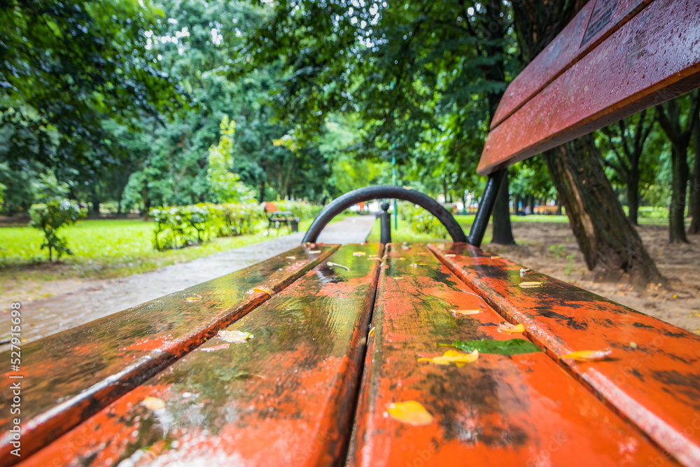 Bench in a path after the rain stops. Summer park with wooden benches after rain. Green park after rain with red benches