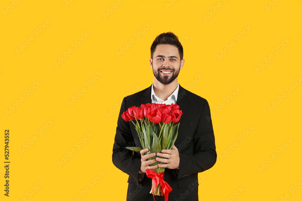 Happy man holding red tulip bouquet on yellow background. 8th of March celebration