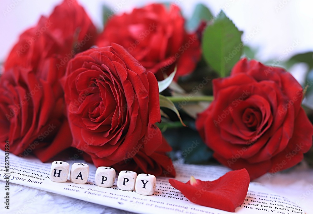 a bouquet of red roses and an inscription of letters happiness on a vintage newspaper on a plaid. The concept of romance, holiday morning, happiness, birthday