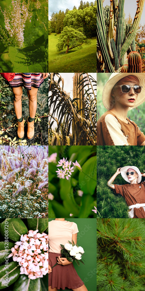 Set of trendy aesthetic photo collages. Minimalistic images of one top color. Country style fashion moodboard