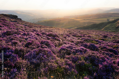 Absolutely beautiful sunset landscape image looking from Higger Tor in Peak District across to Hope Vally in late Summer with heather in full purple bloom
