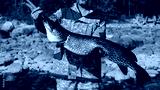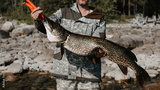 male fisherman holds a large fish pike caught on the shore of the lake against the background of stones