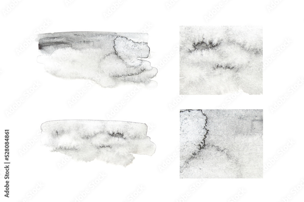 Watercolor silver texture background. Hand drawing art set. Vintage backdrop banner. Aquarelle ground paper. Abstract grey wet image. Impression stain template